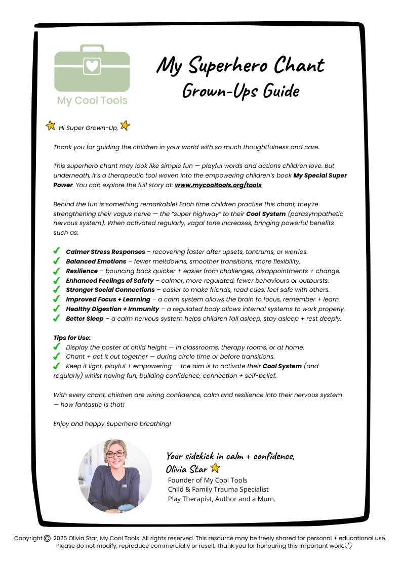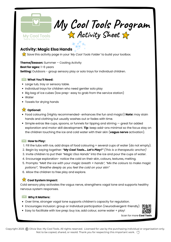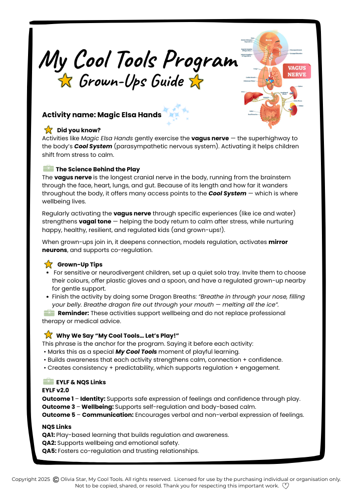 Grounded in polyvagal theory and nervous system research, each tool helps children strengthen their “Cool System” — supporting the shift from stress to regulation and calm through practical, playful strategies that truly work.