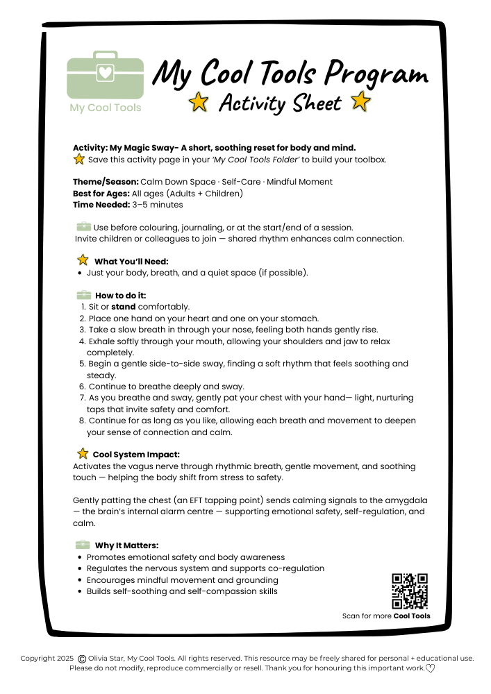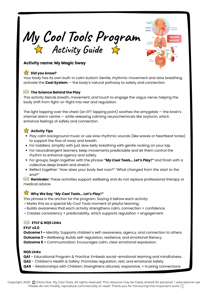At My Cool Tools, every activity is created to help children feel safe, calm, confident, and connected — using simple, body-based strategies that activate the Cool System (the vagus nerve and parasympathetic pathways).